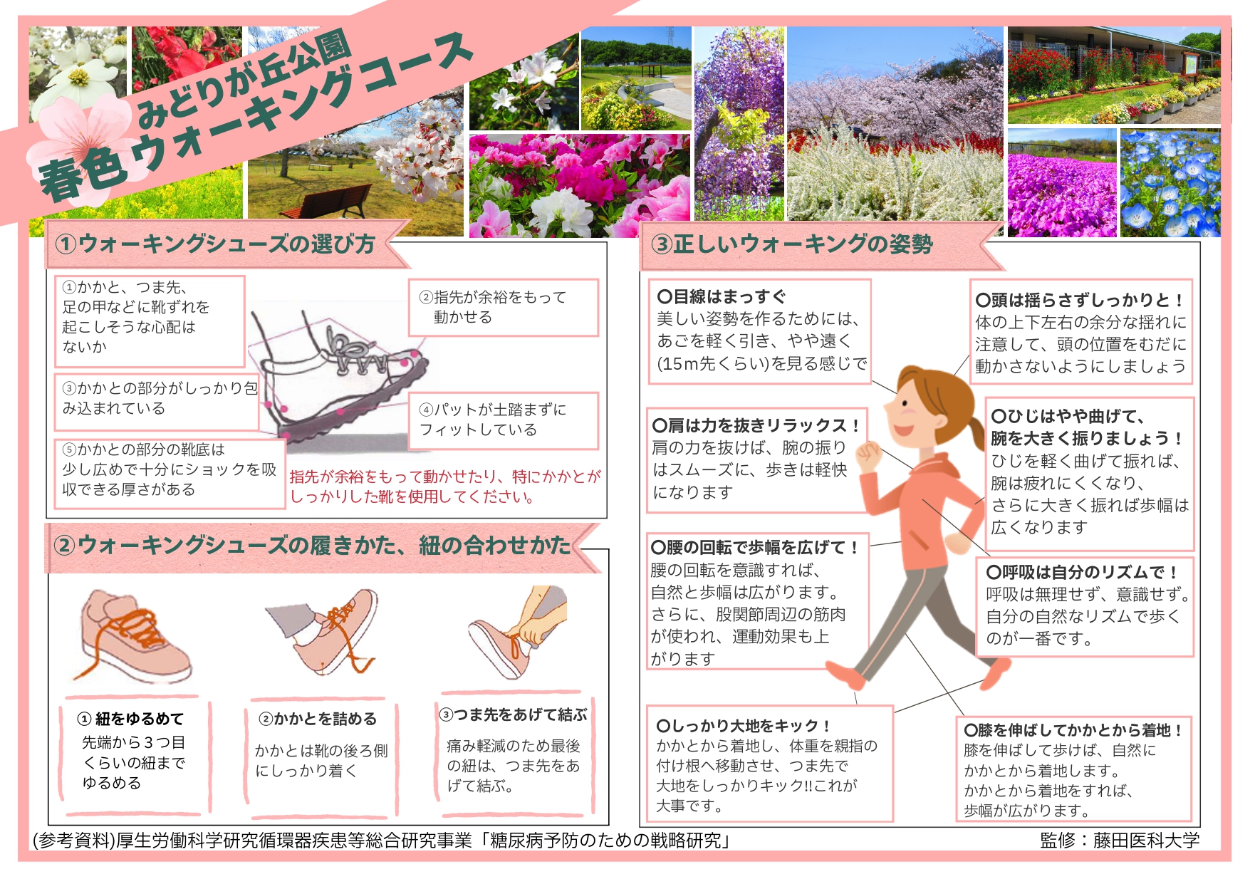 ウォーキングシューズの選び方から履きかた、紐の合わせかた、正しいウォーキングの姿勢について藤田医科大学に監修していただき、わかりやすい図解による説明が載っています。