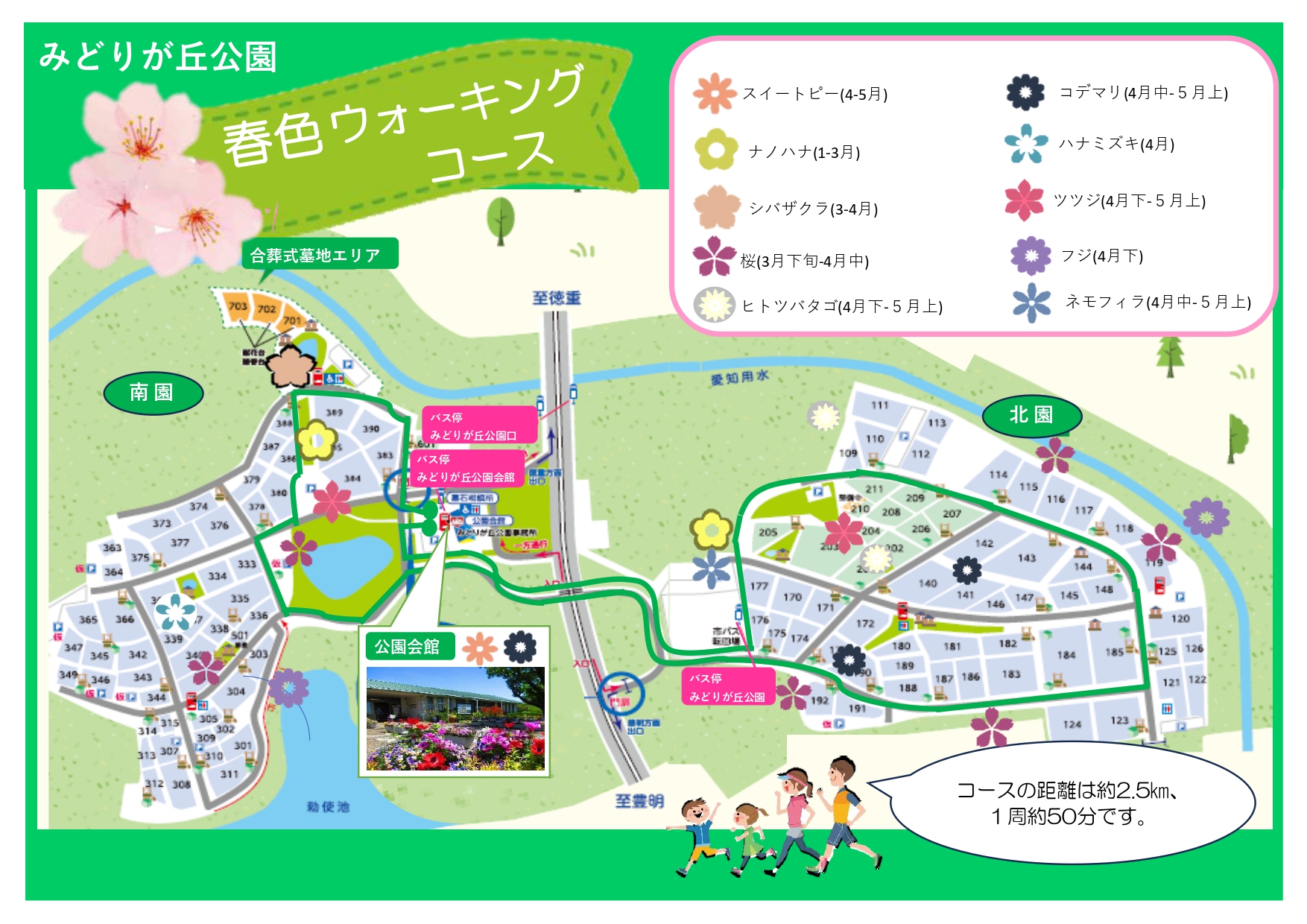 また、園内の地図にウォーキングコース(距離・時間)の他、春の花々の見ごろの時期と場所も載っておりますので、ウォーキングの際にお役立てください。